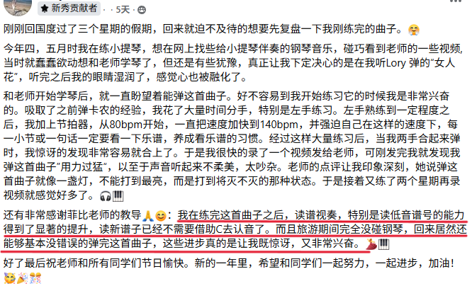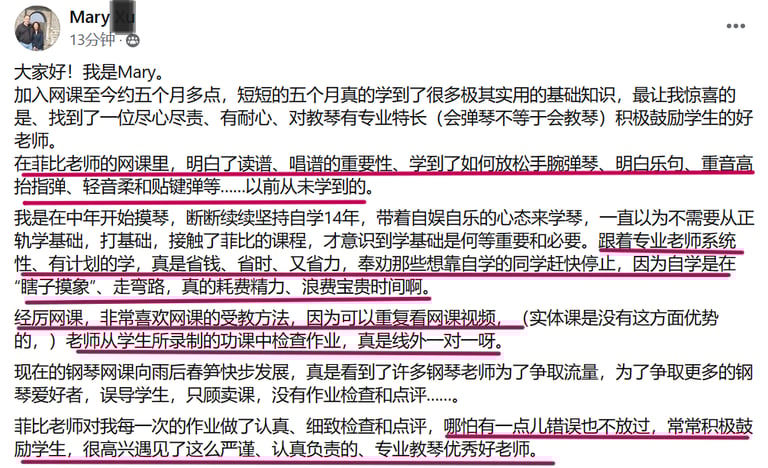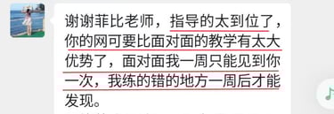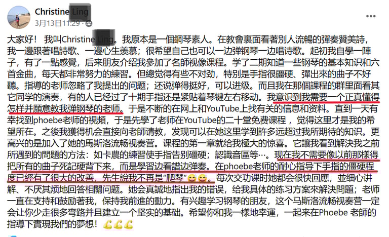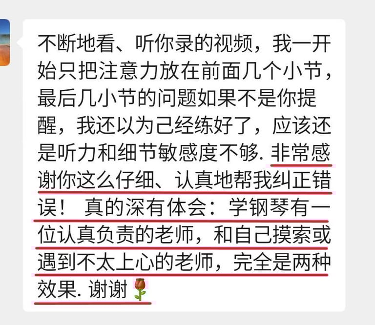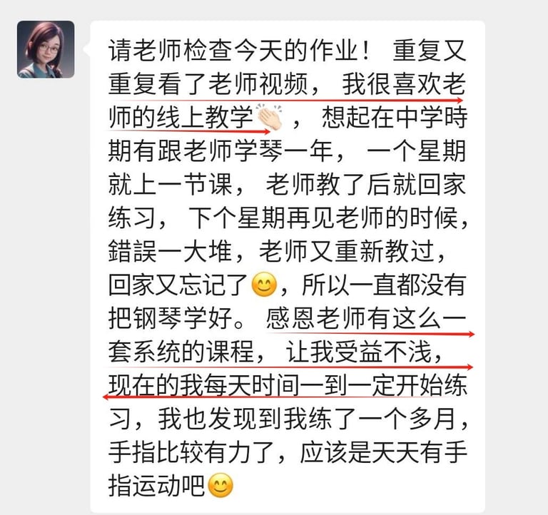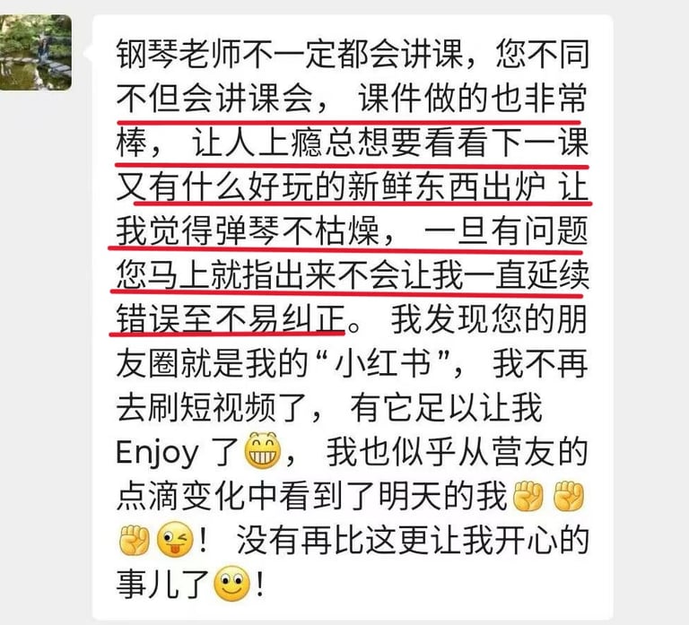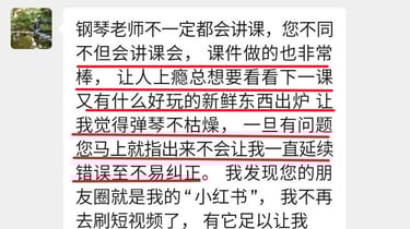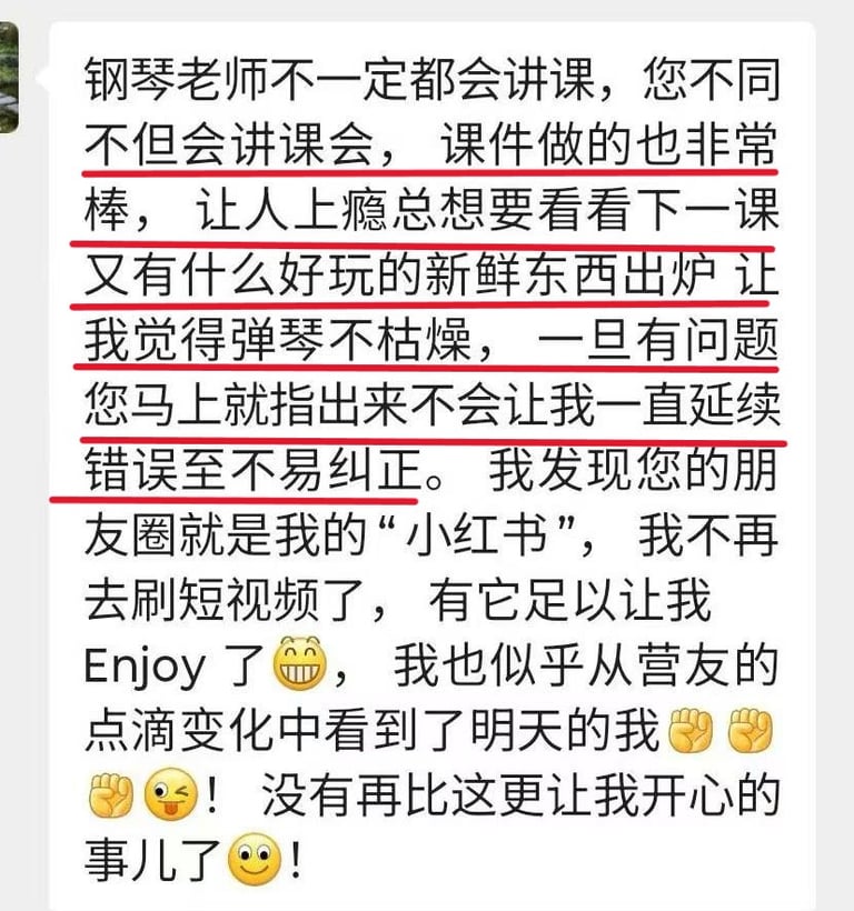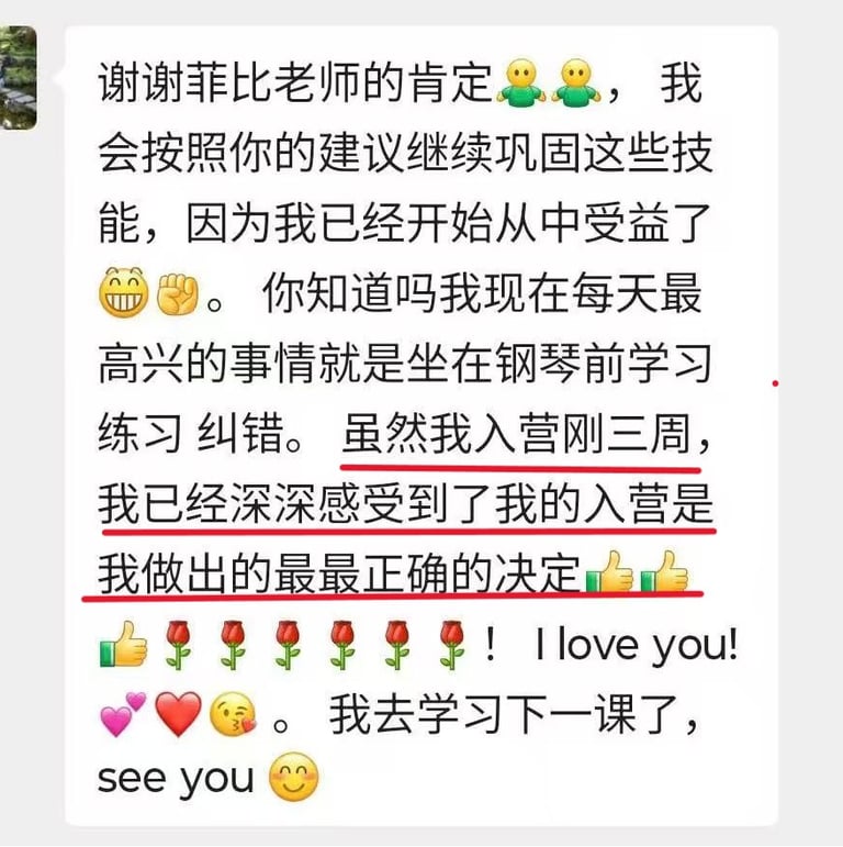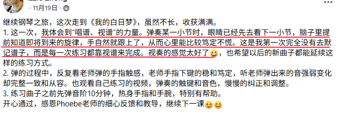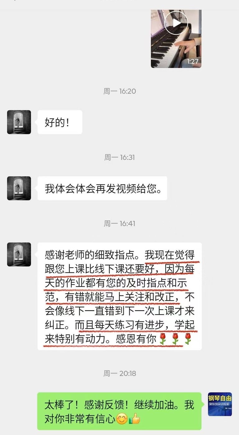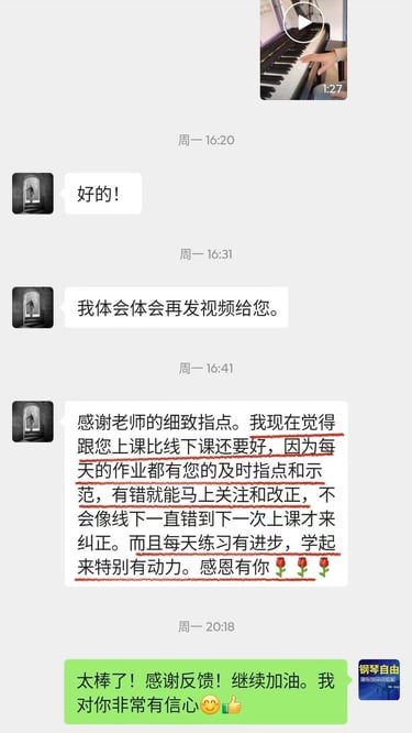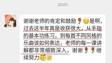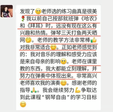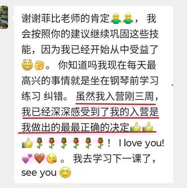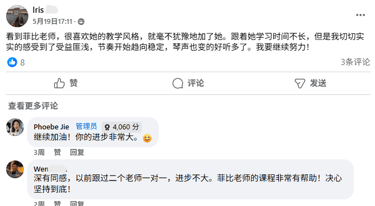 菲比老师教学严谨,认真负责,将这份钢琴课程赋予了鲜活的使命,让我深觉感恩遇见这样一位严师密友。