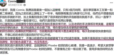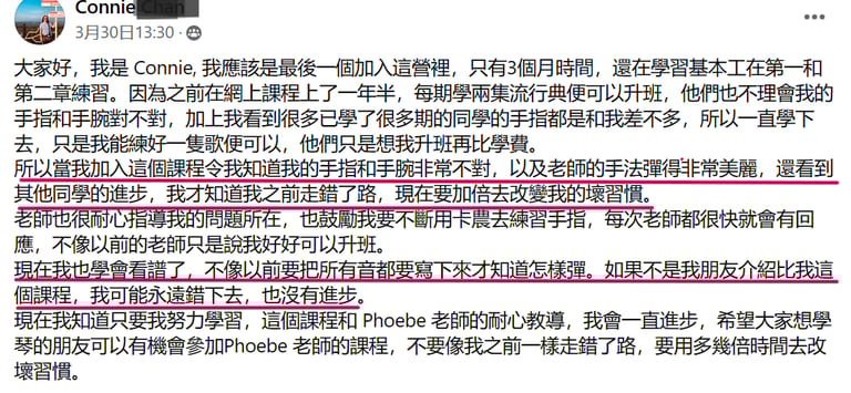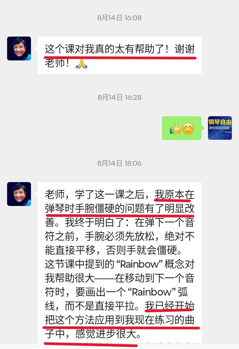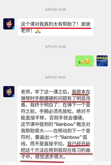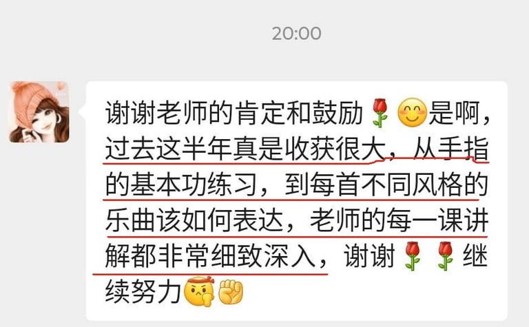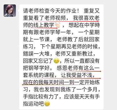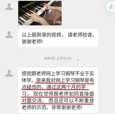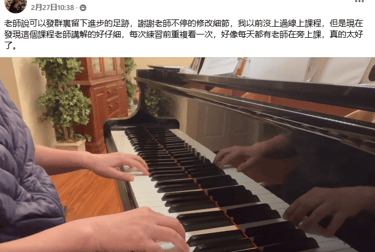 在老师系统化的教学和严格细心的指导下,虽然我才上第二课,就已经感受到自己有明显的进步。我终于了解到基本功的重要,也学会了如何放松和正确的触键