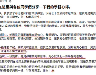我为了要弹出强的音色,自然就夸张高抬手去弹音程,经过老师的纠正,指出这种手势是毫无意义,反而会影响手指落在键盘的准确性,改过来后,确实变得轻松自如,在此要给老师一个赞。