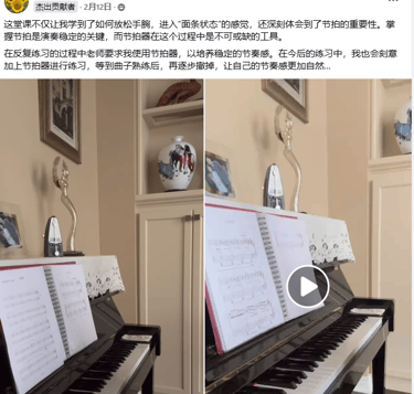 这堂课不仅让我学到了手腕如何放松,还深刻的体会到了节拍的重要性,在练习过程中老师指导我使用节拍器,曲子练熟后再撤掉,节奏准确又自然